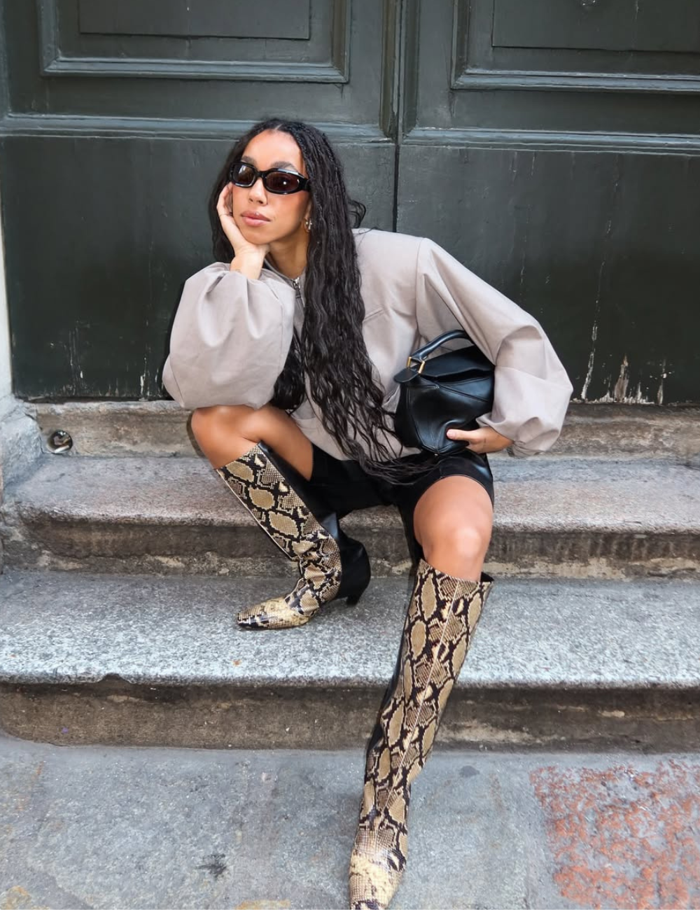 2. Jaqueta + bermuda de couro + bota longa de animal print