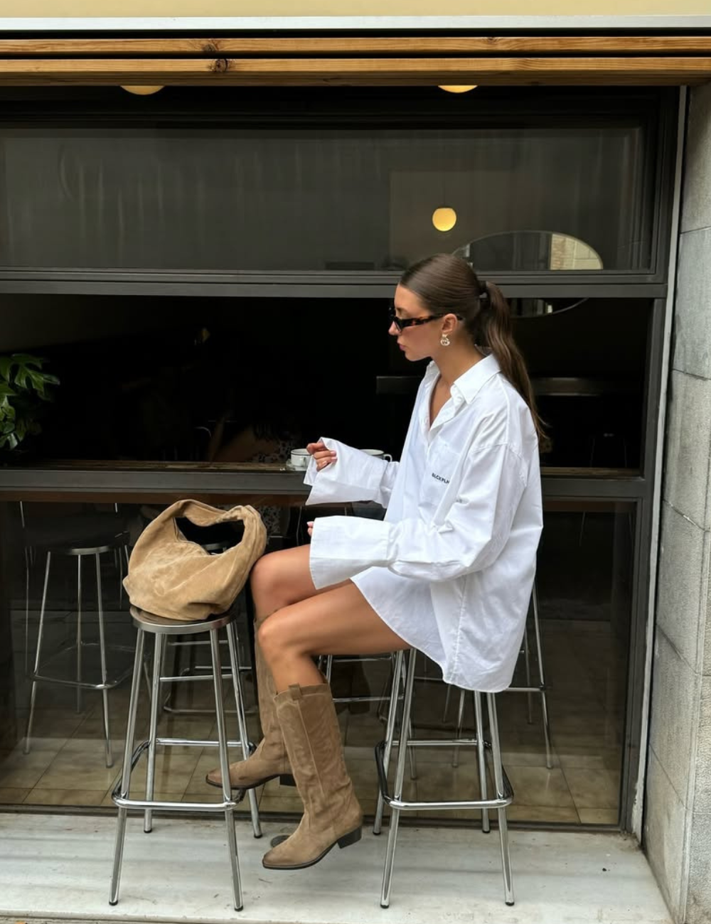 Um look que é a cara daqueles dias de meia-estação. A camisa oversized de algodão contrasta muito bem com os microshorts, enquanto a bota de cano longo estilo western deixa a produção despojada e estilosa.