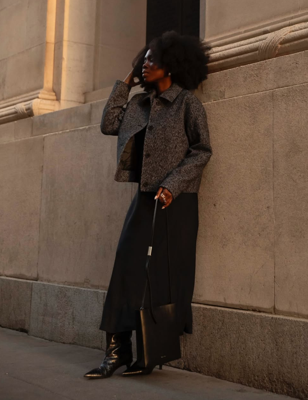 8. Vestido preto longo + casaco texturizado + bota preta longa