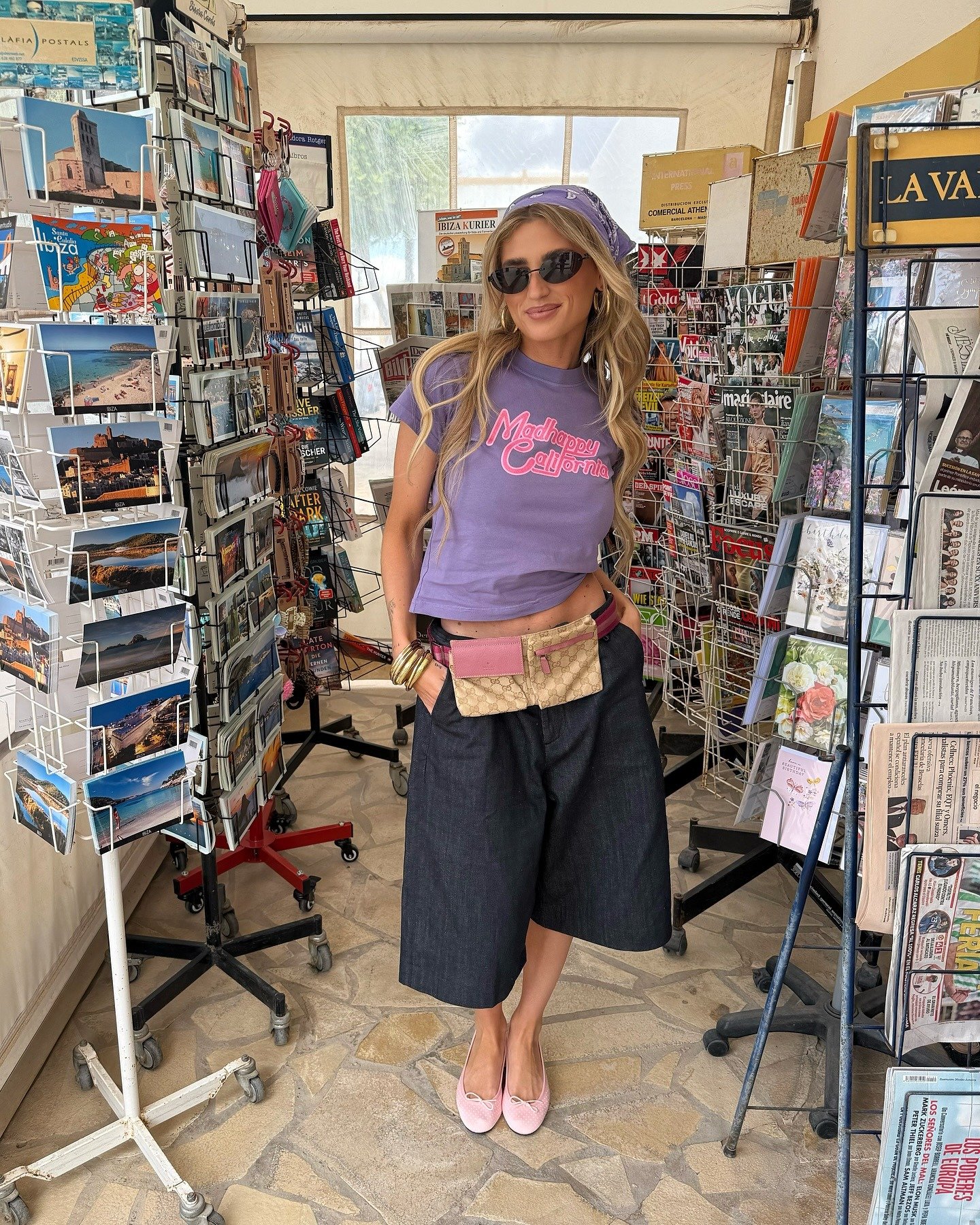 Em outra ocasião, a influenciadora usou novamente uma camiseta estampada e distribuiu as cores do top ao longo do visual, presentes na bandana, pochete e sapatos para manter tudo em harmonia. Na parte de baixo, ela escolheu uma bermuda oversized super fashionista.