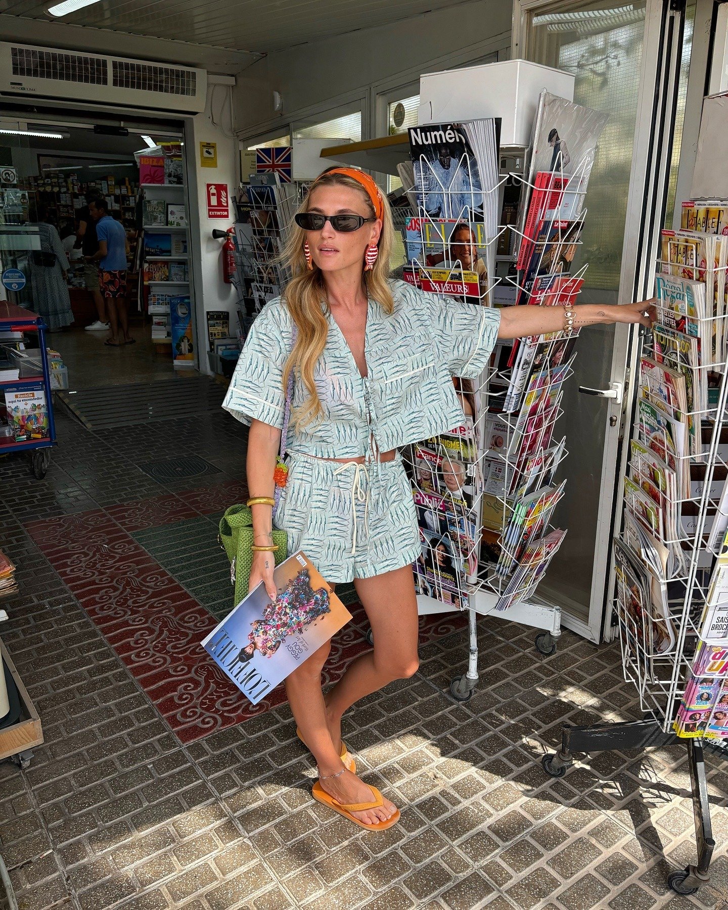 Para fechar, outra ideia que repete o combo de conjunto e chinelo de dedo, só que em outro mood. Tessa apostou em uma versão super estampada e vibrante em tule. Nos pés, ela combinou o sapato do verão na mesma tonalidade para manter um visual monocromático.