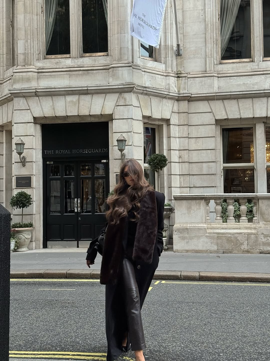 Para um look mais estruturado, o sobretudo entra como peça-chave com a calça de couro. Ele traz essa base mais clássica, enquanto o couro adiciona mais intenção fashion, que é justamente esse contraste que deixa o visual interessante.