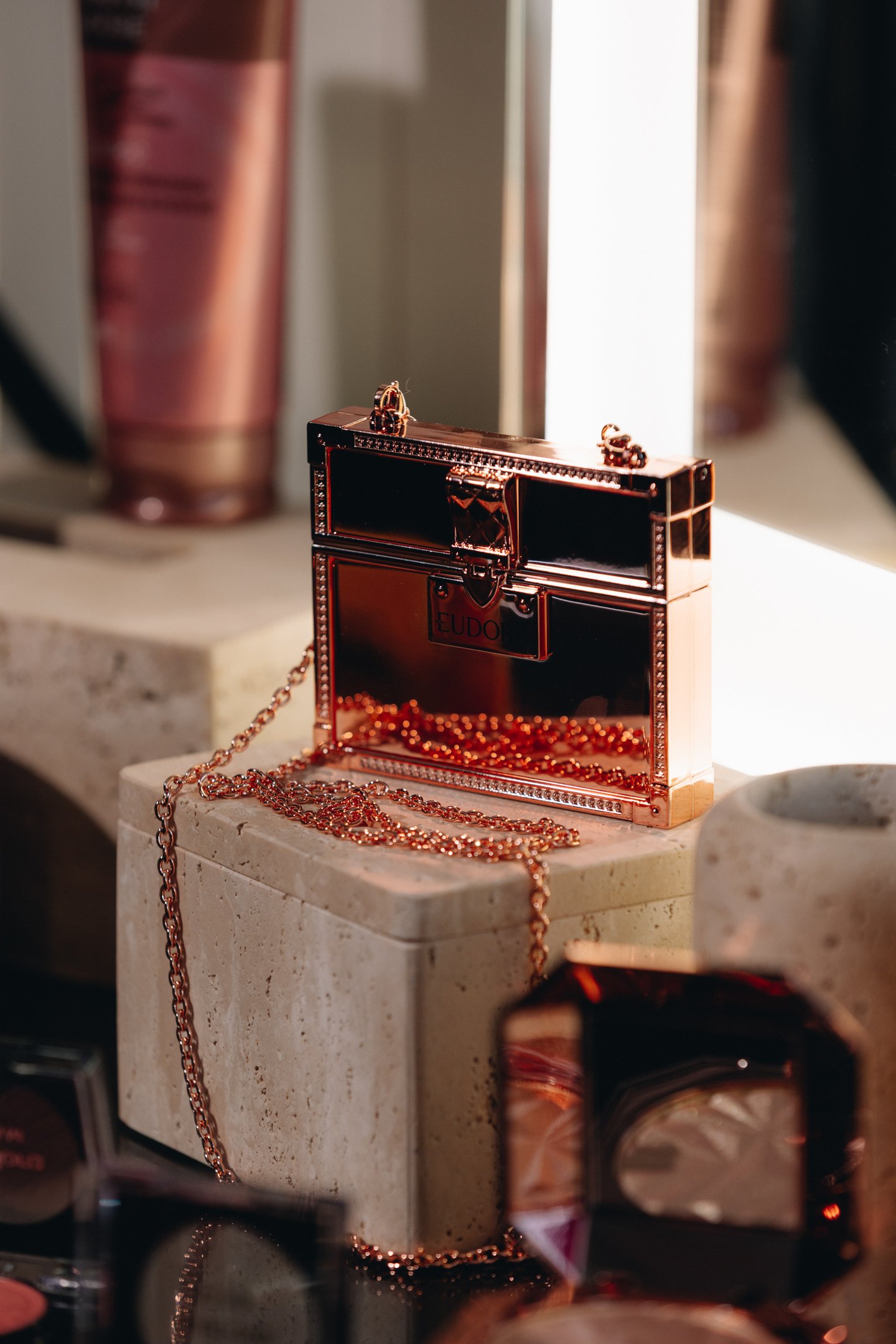 Entre seus aliados favoritos estão os produtos da linha Eudora Metals Rosé — especialmente a paleta clutch, prática e multifuncional, e o iluminador compacto, que entrega o glow perfeito para rosto, olhos e corpo.