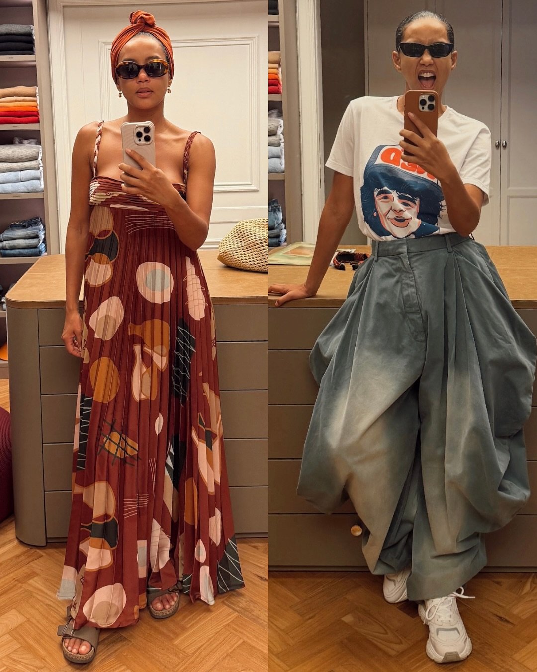 No caso do visual com o vestido, ele foi o grande protagonista, com acessórios da mesma paleta que apenas complementaram a produção. Já no look com camiseta e jeans, o foco foi a calça, que tem um caimento super inusitado, mas muito interessante.