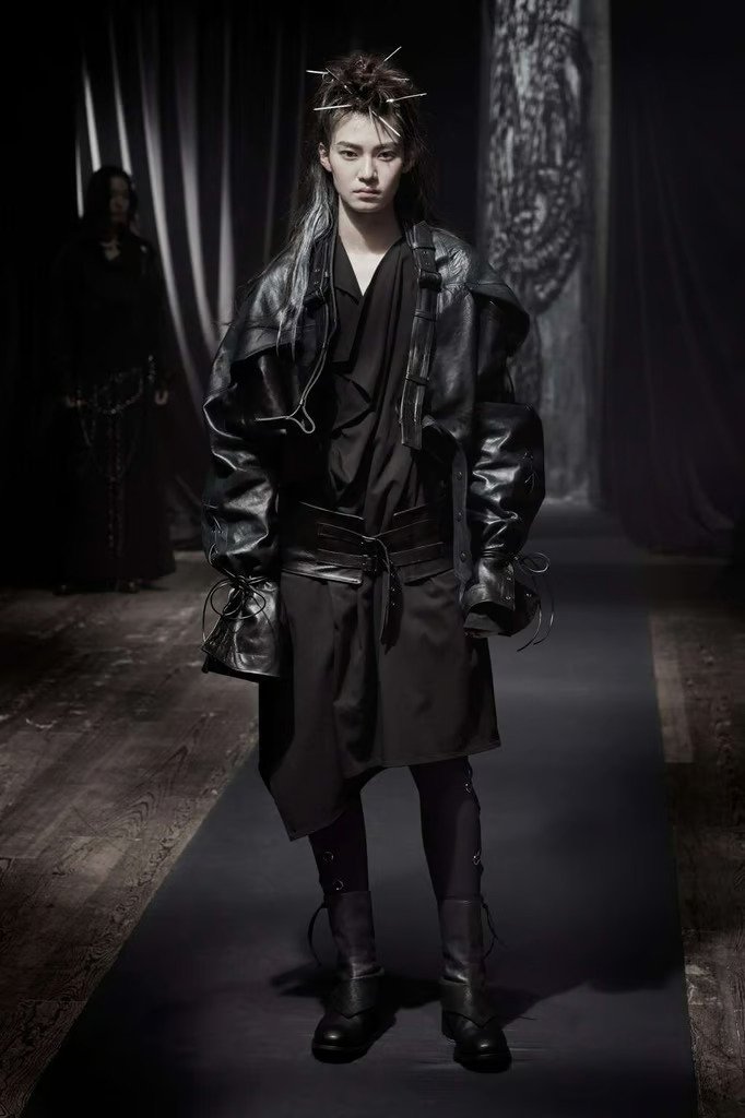 O look era composto por duas peças: uma calça volumosa com pregas e viés dourado nas laterais, em referência à icônica lata de Spaten, e um wagi, também com detalhes dourados e uma flâmula (pequena bandeira) nas costas. As ombreiras estruturadas adicionavam imponência ao visual, remetendo a uma armadura.