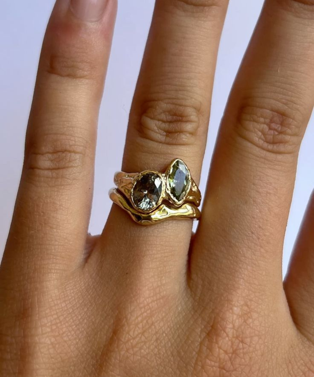 Outra opção para quem quer fugir do anel solitário, a peça cravejada com gemas nas laterais traz mais destaque para a joia. Várias celebridades já apostaram no design geométrico, como Angelina Jolie e Brad Pitt, que escolheram um diamante retangular para protagonizar a peça. Ainda há a alternativa de pedras ovais para o modelo, trazendo um visual mais sofisticado e minimalista.