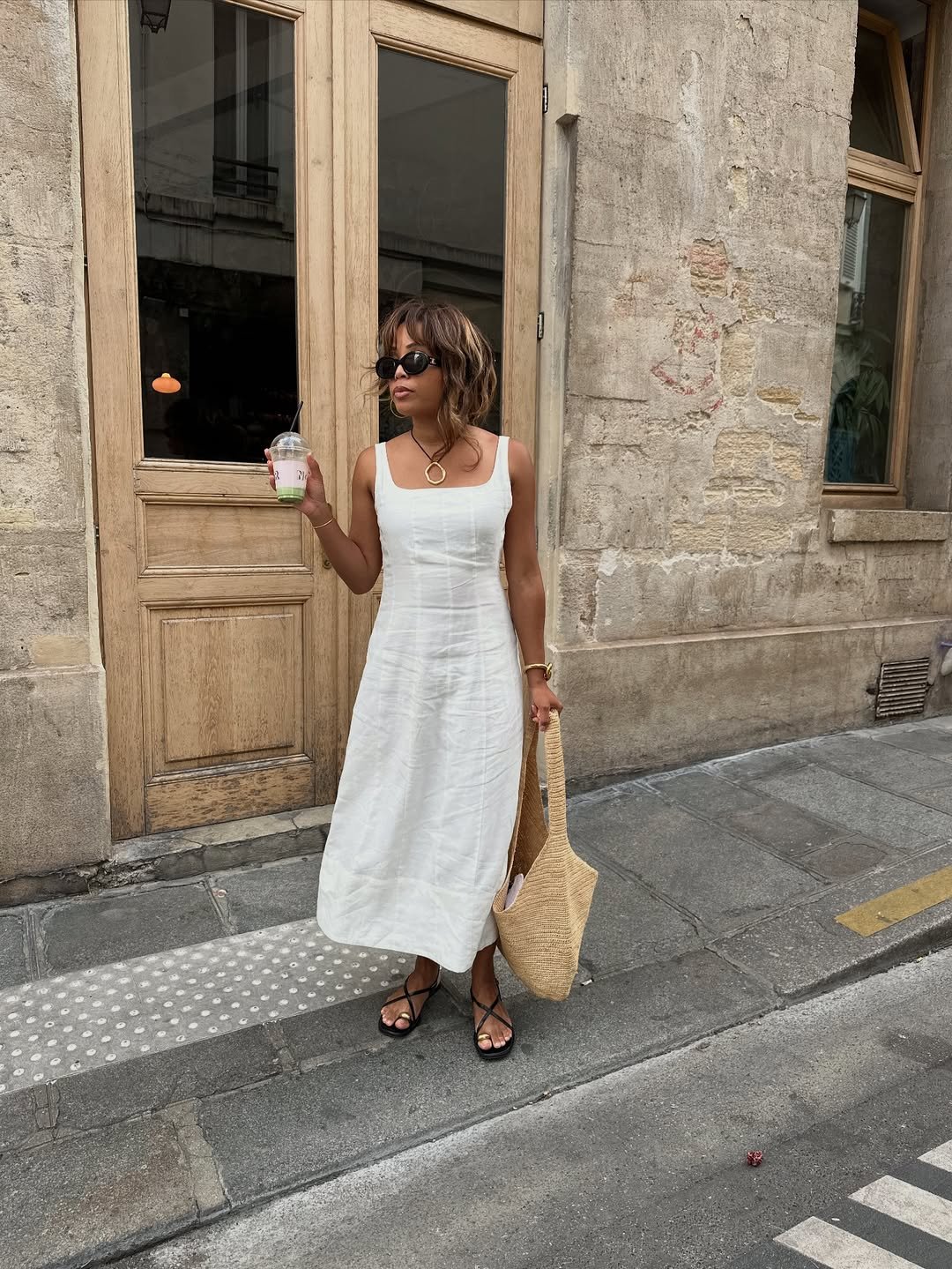Vestidos curtos de alcinha são frescos e fáceis de usar. Aposte nas rasteirinhas coloridas, como o vermelho tomate, para modernizar o look.