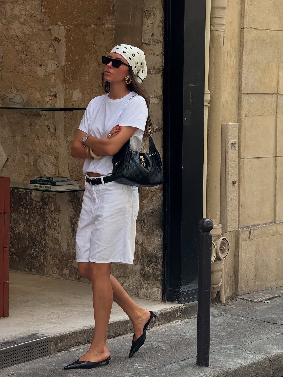 Bermuda branca com top tube e mule: fresquinho, versátil e ideal para o calor.