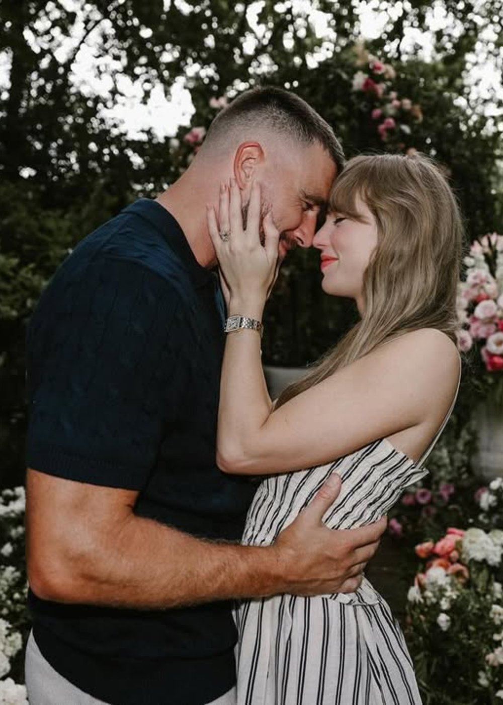 Sim, Taylor Swift está noiva! Ela disse sim a Travis Kelce, que a presenteou com um anel retangular de lapidação Old Mine.
